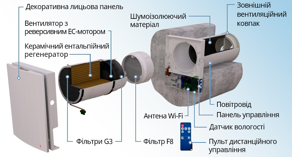 Устройство легко устанавливается в стену и комплектуется наружным колпаком. Фильтры очищаются пылесосом или промывкой, а регенератор достаточно чистить раз в год.