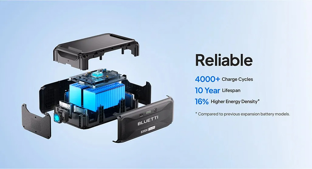 Батарея Bluetti B300K использует передовую технологию литий-железо-фосфатных аккумуляторов (LiFePO₄), которая гарантирует долговечность и безопасность эксплуатации. Она выдерживает более 4000 жизненных циклов, что существенно превосходит ресурс обычных батарей. Благодаря этому вы получаете стабильный и надежный источник энергии на долгие годы, также отличающийся высоким уровнем защиты от перегрева и перезаряда.