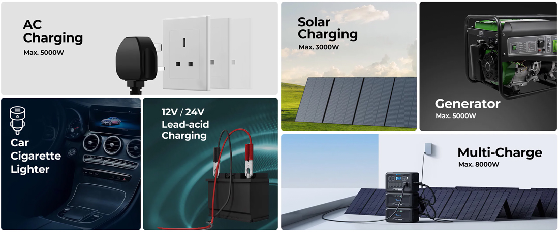 Система AC500 разработана для подзарядки любым способом, который вам нравится, например, непосредственно подключаясь к солнечным панелям, автомобильному прикуривателю или более эффективно с помощью зарядного кабеля мощностью 5000 Вт. Что еще интереснее, так это то, что AC500 может поддерживать до 8000 Вт колоссальной потребляемой мощности, благодаря чему полностью заряжается за 1,5 часа.