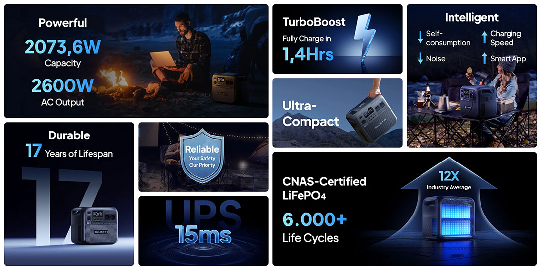 Bluetti Elite 200 V2 2600W 2073Wh – портативная зарядная станция с литий-фосфатным аккумулятором, предназначенная для стабильного резервного энергоснабжения дома, походов и площадок без доступа к сети. Она сочетает в себе большой запас энергии, чистую синусоиду и удобное управление через мобильное приложение.