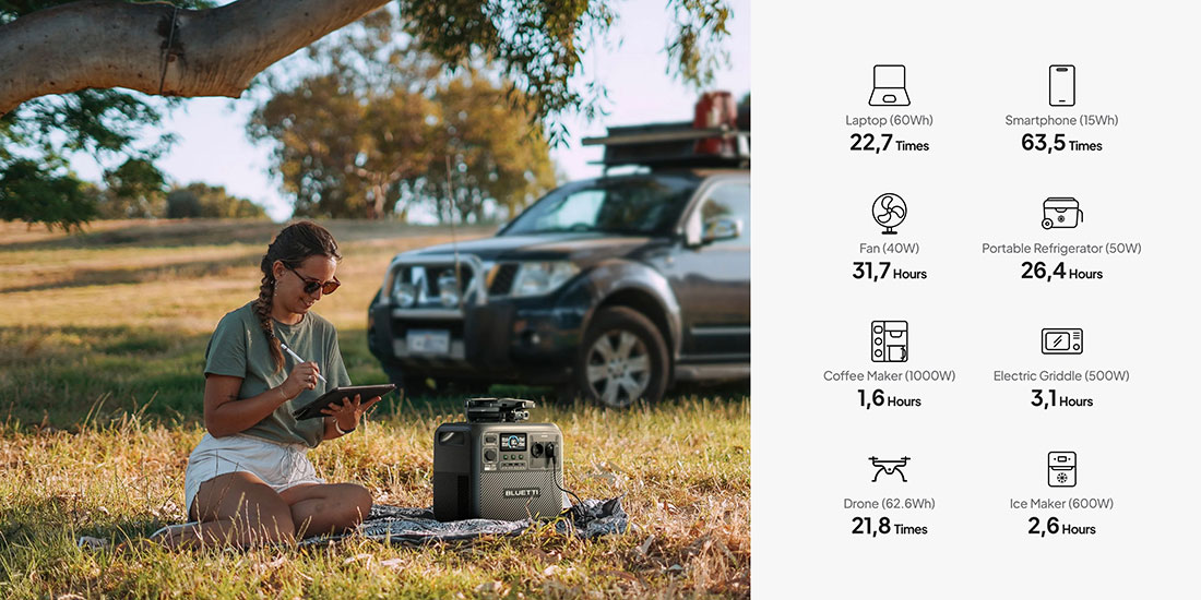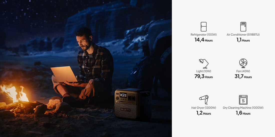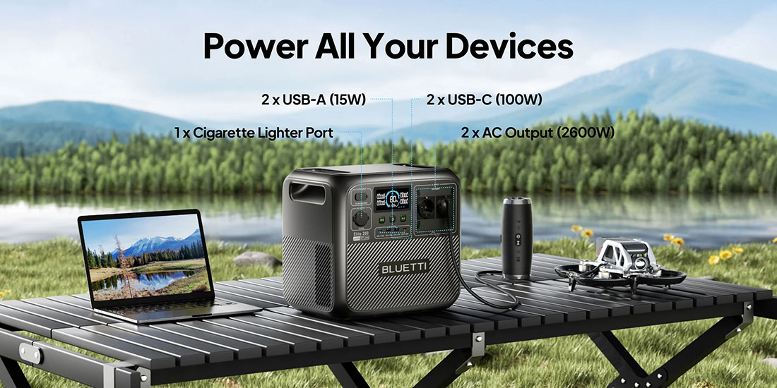 Выезд на природу, кемпинг, строительные площадки и места без стабильного энергоснабжения. Bluetti Elite 200 V2 обеспечивает питание холодильника, компьютера, инструментов, освещения и небольших электроприборов в отсутствие сети.