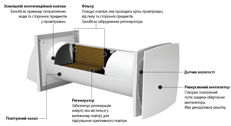 Рекуператор оснащен шнурковым переключателем скоростей, а монтаж производится в стену с минимальным вмешательством в конструкцию здания. Благодаря защите IP24 устройство устойчиво к воздействию влаги.