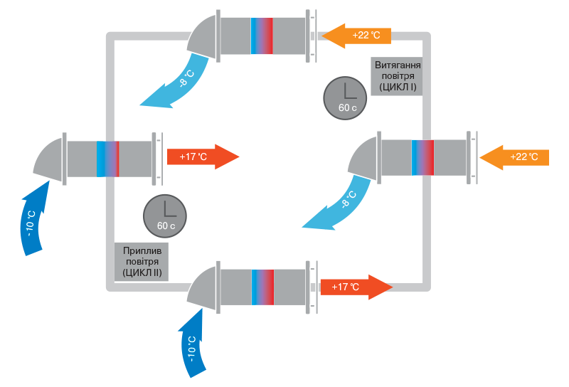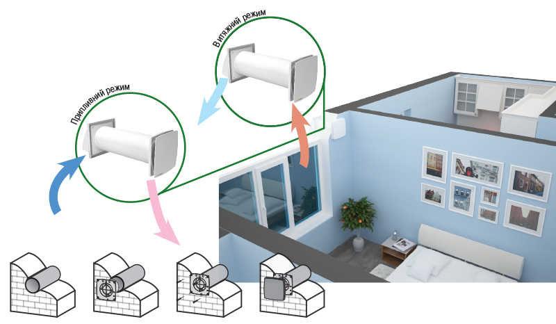 - Различные режимы работы – рекуперация тепла/холода, прилив, вытяжка.