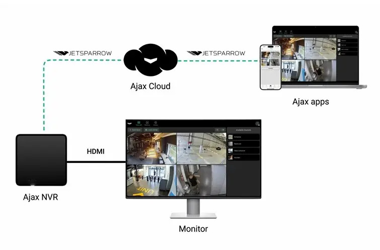 HDMI и два порта USB превращают видеорегистраторы NVR H в полноценный центр мониторинга: достаточно подключить дисплей и устройства ввода. После начальной настройки наблюдение возможно даже без доступа к сети. Приложения Ajax для смартфонов и компьютеров предоставляют удаленный просмотр записей, изменение настроек и управление доступом в любое время и из любого места.