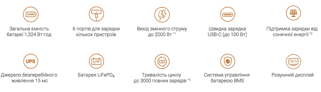 - USB-C розетка (×1): 5 В━3 А / 9 В━3 А / 15 В━3 А / 20 В━5 А (макс. 100 Вт) с протоколом PD