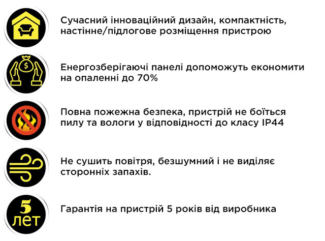 індикатор роботи; регулювання температури; дисплей; цифровий датчик температури; управління – механічне; монтаж настінний, підлоговий (опція); контроль температури - повітрям у приміщенні; довжина кабелю живлення – 1.5 м