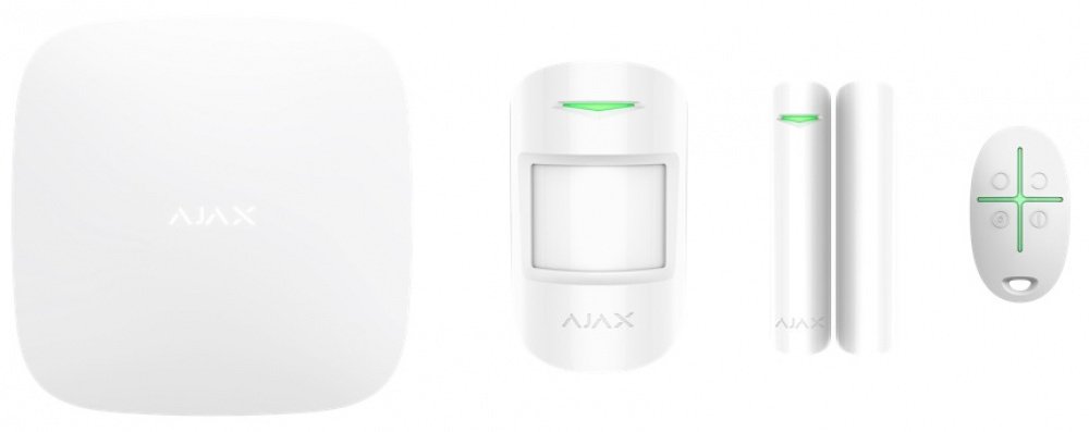 Стартовий комплект системи безпеки Ajax Складається з хаба, датчика руху, датчика відкриття та брелока з тривожною кнопкою.