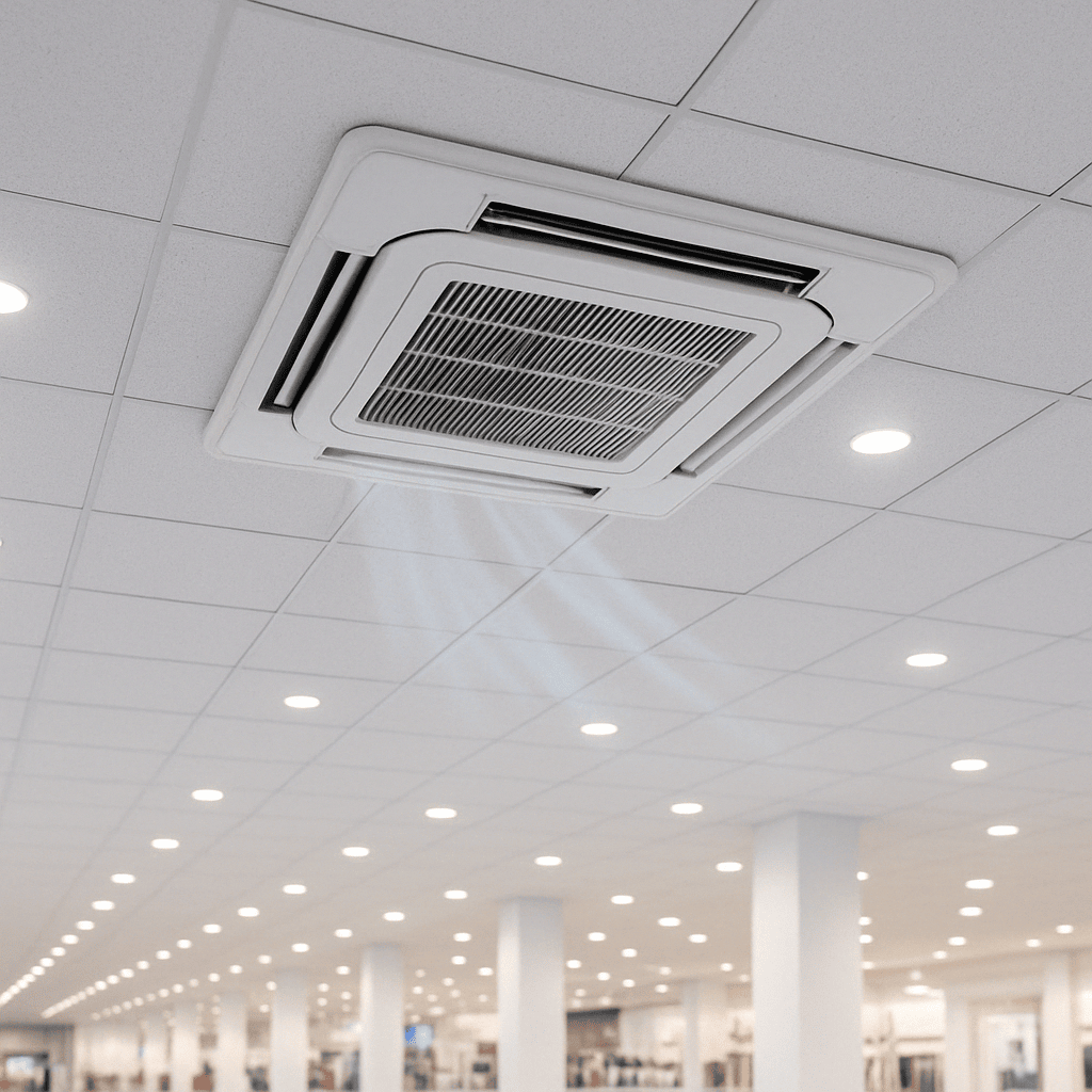 Касетний кондиціонер - інший вид вбудованої системи. Внутрішній блок касетного типу встановлюється в підвісну стелю, його нижня панель має вигляд решітки розміром приблизно 60×60 см (стандартна стельова плитка). Через цю решітку охолоджене повітря розходиться відразу в чотирьох напрямках, забезпечуючи охолодження великого приміщення рівномірно. Касетні блоки затребувані в залах магазинів, ресторанах, офісах відкритого типу - там, де потрібен потужний потік повітря, але підлогове або настінне обладнання заважало б дизайну. Касетник, як і канальна система, вимагає наявності міжстельового простору для монтажу і підключення до зовнішнього блоку. Плюси касетних і канальних кондиціонерів - це можливість охолоджувати кілька зон одним блоком, прихованість установки і професійний вигляд системи. Вони незамінні, коли важливо не порушувати інтер'єр побутовими приладами або потрібно кондиціонувати відразу велику площу. Мінуси - вища вартість обладнання та монтажу, порівняно з побутовими настінними сплітами, а також складність встановлення (потрібно буде робити підвісну стелю, прокладати комунікації). Для будинку такий варіант зазвичай обирають на стадії будівництва котеджу або дорогого ремонту, а ось у комерційному секторі касетні та канальні системи дуже поширені.