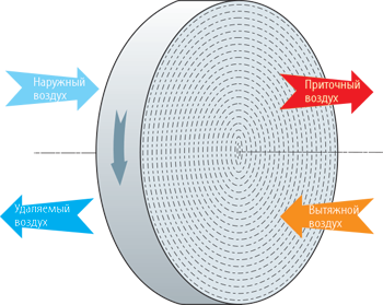 - При вращении лента, из которой выполнен регенератор, контактирует сначала с приточным, а затем с вытяжным воздушным потоком.